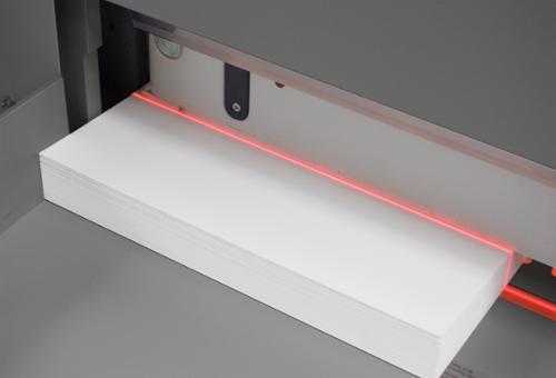 Operation of the Formax Cut-True 28A Programmable Automatic Guillotine Cutter is simple: utilize the touchscreen control panel to program and select job settings, then load a stack of paper, up to 3.15” high. Set the back gauge using the touchscreen., and the electronic fine-adjustment knob. The bright LED Cutting Line allows operators to see exactly where the blade will cut and make fine adjustments. The electronically controlled two-hand operation engages the hardened steel blade for crisp, accurate cuts, every time.